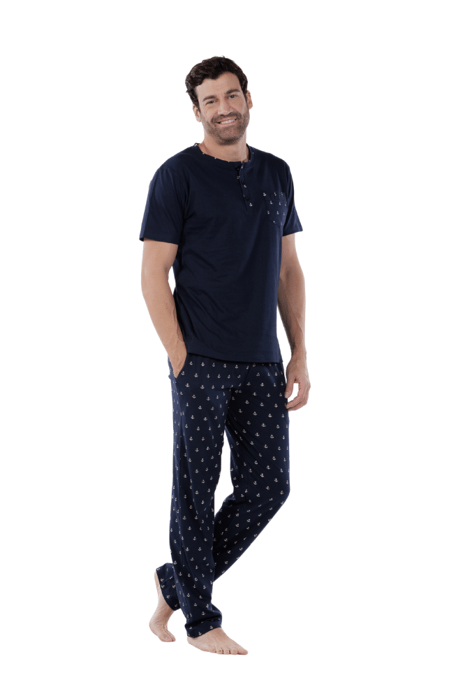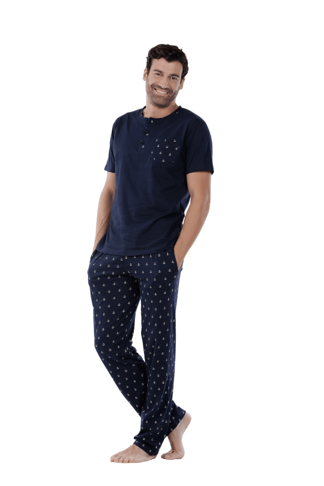 Men’s pajama set. Short-sleeved shirt combined with long pants.