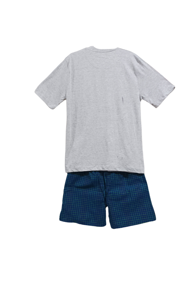 Men’s pajamas with 3 buttons on the top, short sleeve and shorts.