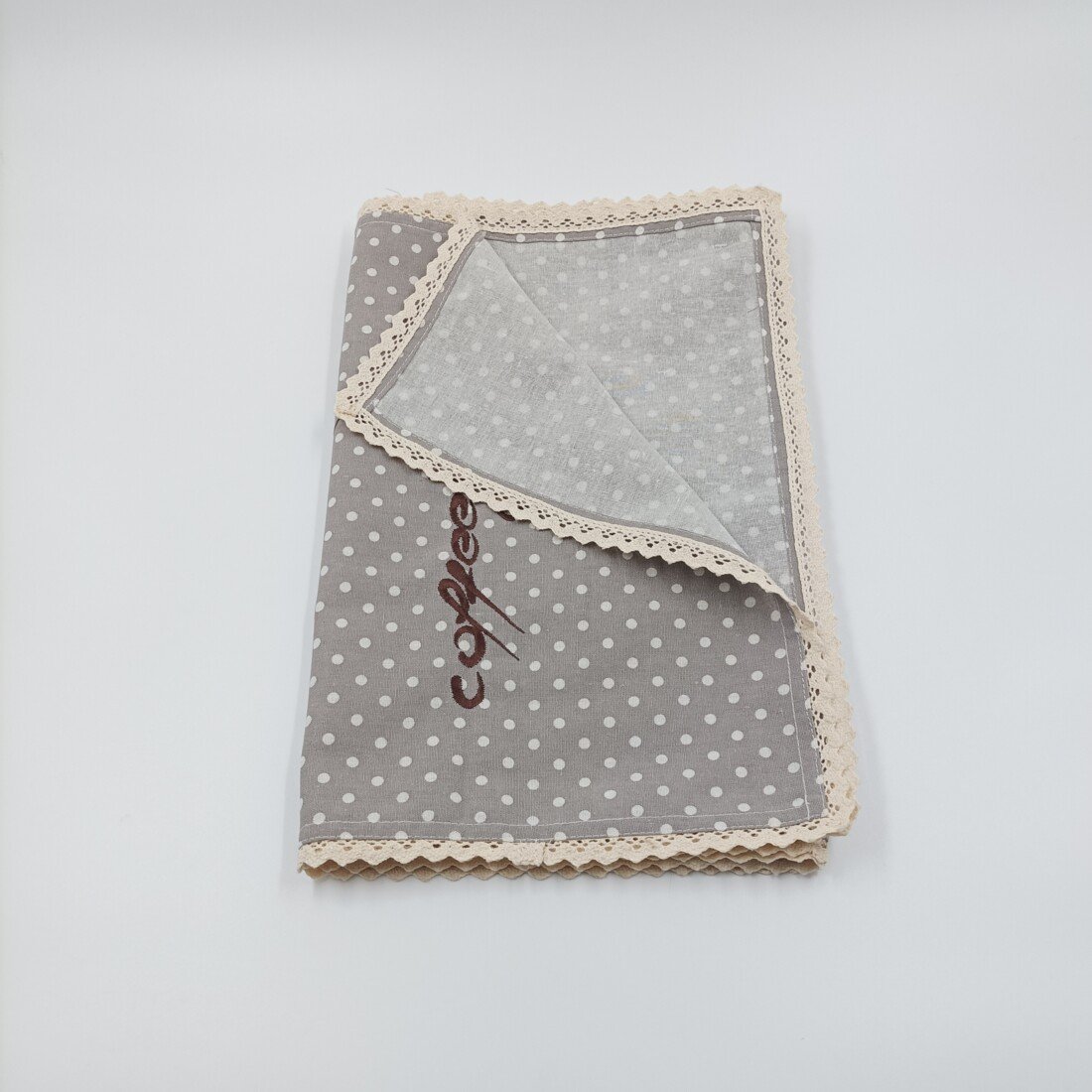 Traverse with gray polka dots, embroidered letters Coffee and beige lace.