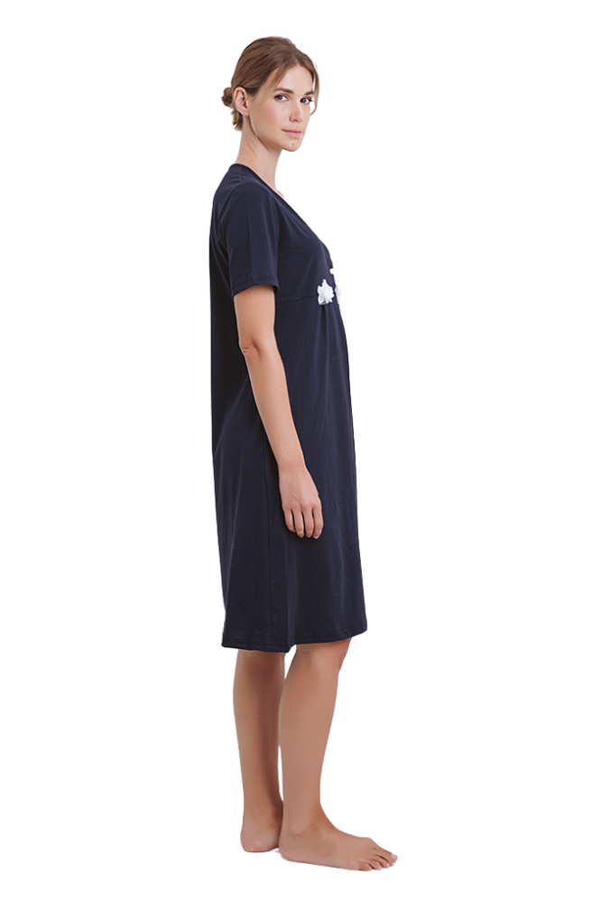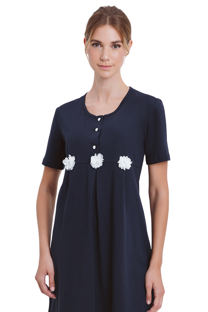 Το νυχτικό διαθέτει κοντά μανίκια και είναι κατασκευασμένο σε απαλό μονόχρωμο ντεσέν με 3 κουμπιά και στολισμένα λουλούδια, προσδίδοντας έναν αέρα νεανικότητας, απαλότητας και θηλυκότητας. Μια επιλογή ιδανική για όλες τις στιγμές στο σπίτι.