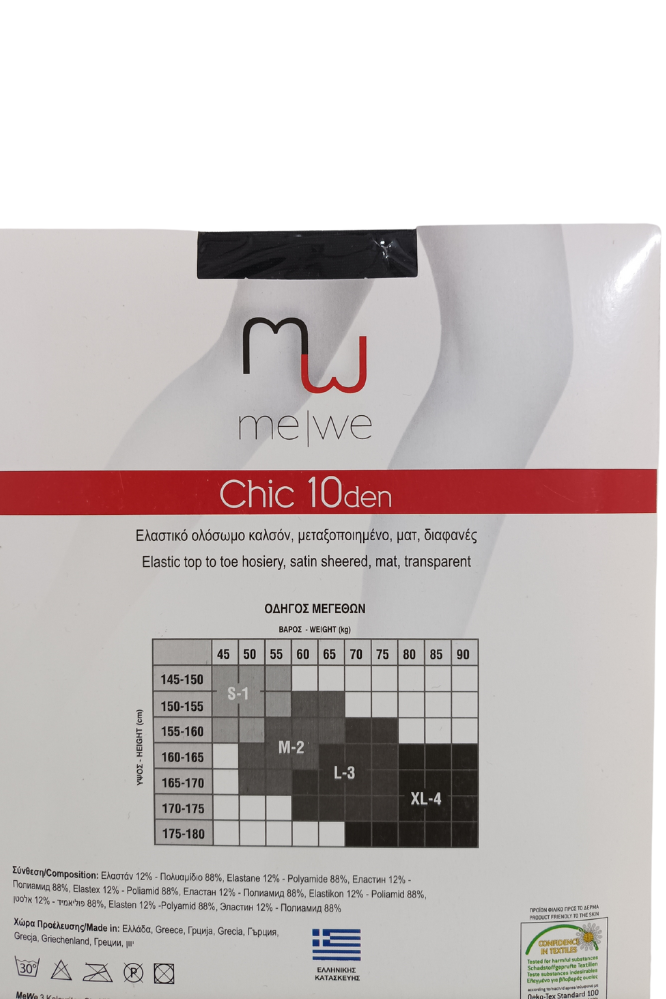Chic 10den, Ελαστικό ολόσωμο καλσόν, μεταξοποιημένο, ματ, διαφανές. Ελαστικό και απαλό χάρη στη διπλοεπενδεδημένη lycra που περιέχει. Ολόσωμο με γάζωμα πλακοραφή (επίπεδη ραφή) για να μην διαγράφει και διπλό καβάλο στο μέγεθος xl για ακόμα μεγαλύτερη άνεση. Ειδική λεπτή πλεξη στη μύτη για να μην φεύγει η θηλιά.