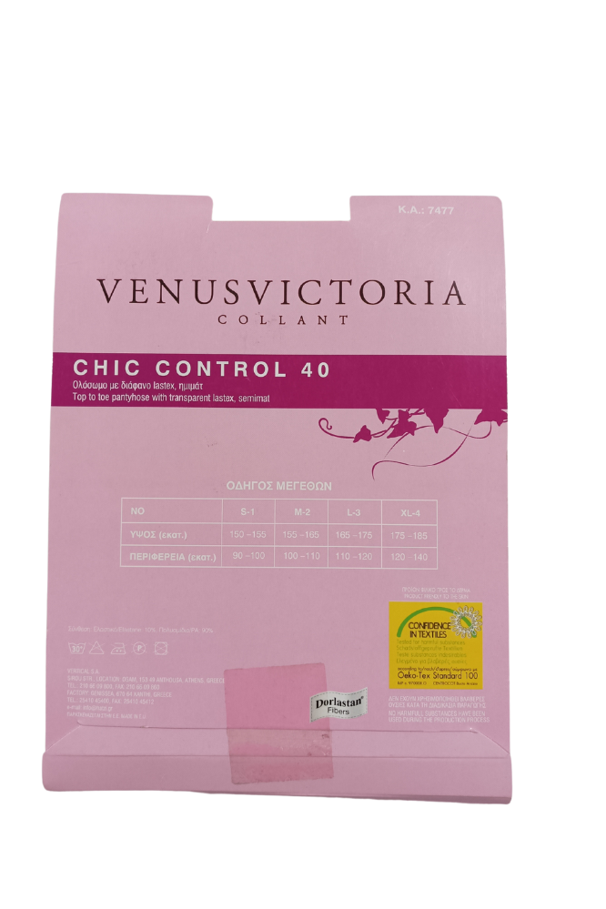 Καλσόν CHIC CONTROL 40 από την Venus Victoria. Ένα ολόσωμο καλσόν στα 40 DEN με διάφανο lastex, μάτ. Είναι ιδανικό για καθημερινές αλλά και επίσημες εμφανίσεις.